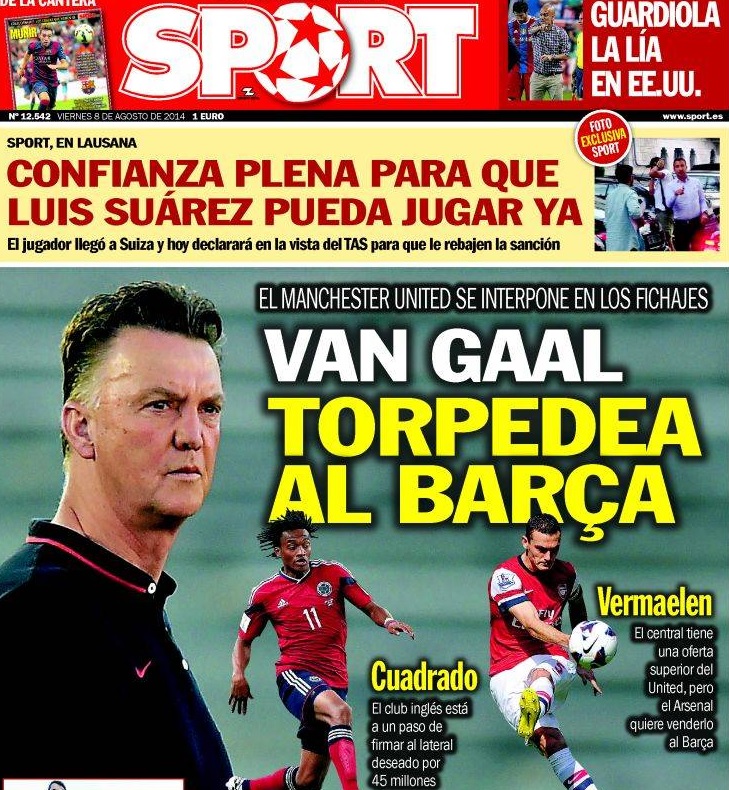 Il quotidiano sportivo catalano Sport dedica il titolo di prima pagina all'intromissione del tecnico del Manchester United Louis Van Gaal in due trattative che interessano il Barcellona, ovvero quelle per l'esterno della Fiorentina Juan Cuadrado e per Thomas Vermaelen dell'Arsenal: "Van Gaal sabota il Barcellona". Il tecnico olandese sta cercando di strappare i due giocatori a Luis Enrique, che ha chiesto questi due rinforzi per completare la rosa blaugrana. Sempre in prima pagina infatti, c'è scritto come il colombiano gigliato sia ad un passo dal firmare per i Red Devils per una cifra di circa 45 milioni di euro.