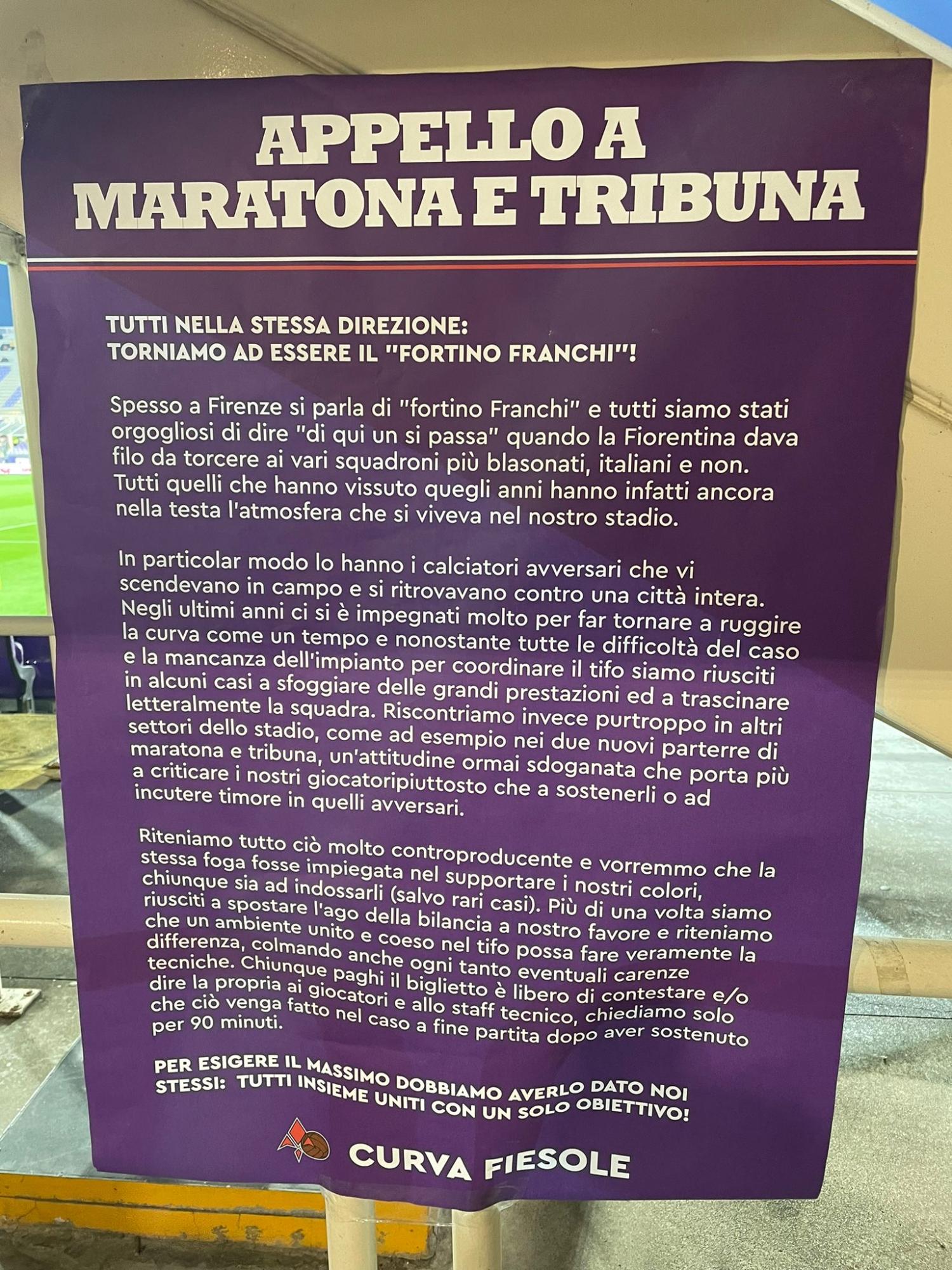 Nel pre partita di Fiorentina-Torino è stato consegnato un comunicato sia in maratona che in Tribuna da parte della Curva Fiesole. Un appello ai due settori che recita così: