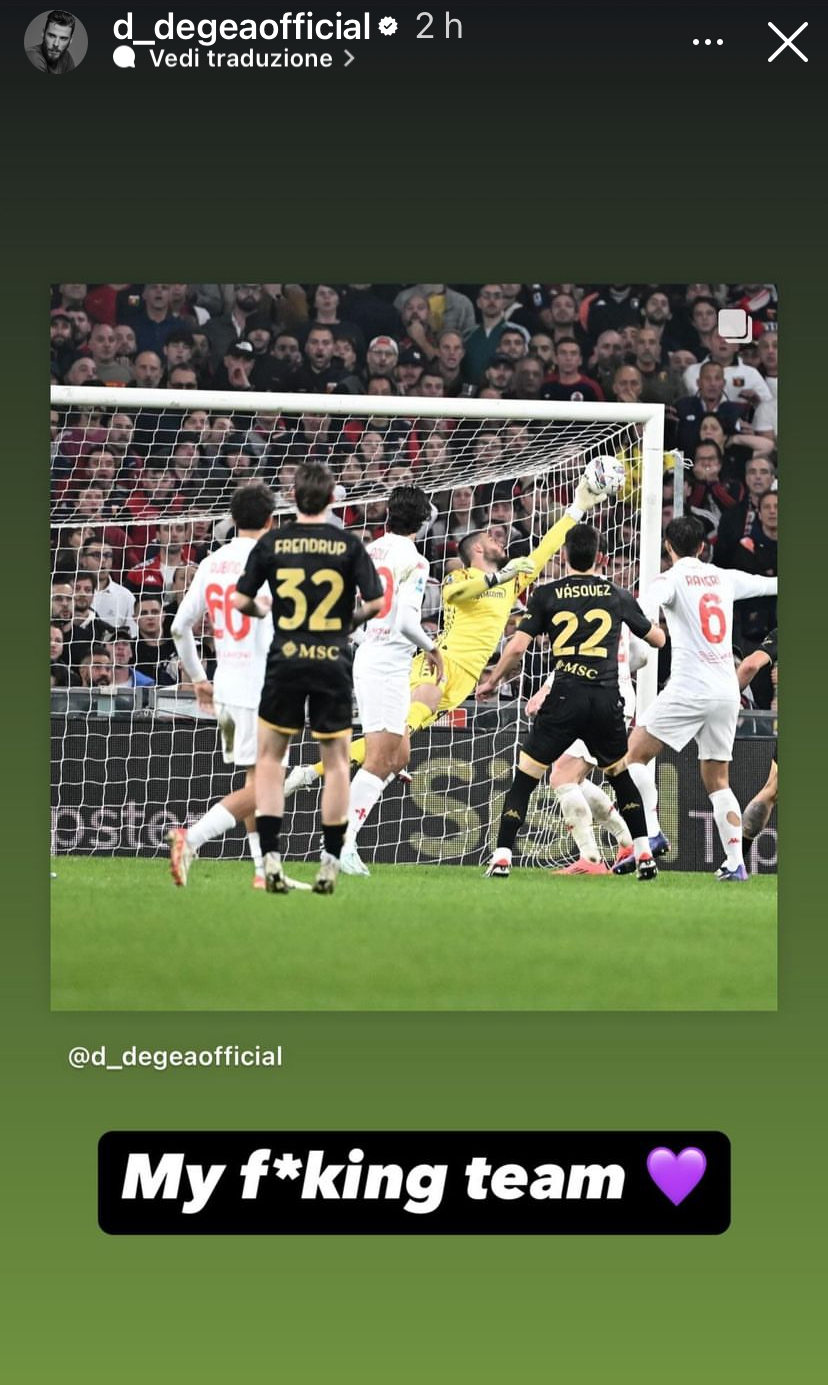 Il portiere della Fiorentina David De Gea ha salvato il risultato con una grande parata, per la quale è stato premiato come uomo-partita dalla lega Serie A. In una storia esulta: "La mia fottuta squadra" si lascia andare per poi postare anche il premio della Lega: "Grande grande vittoria, continuiamo la caccia ai nostri obiettivi" scrive.