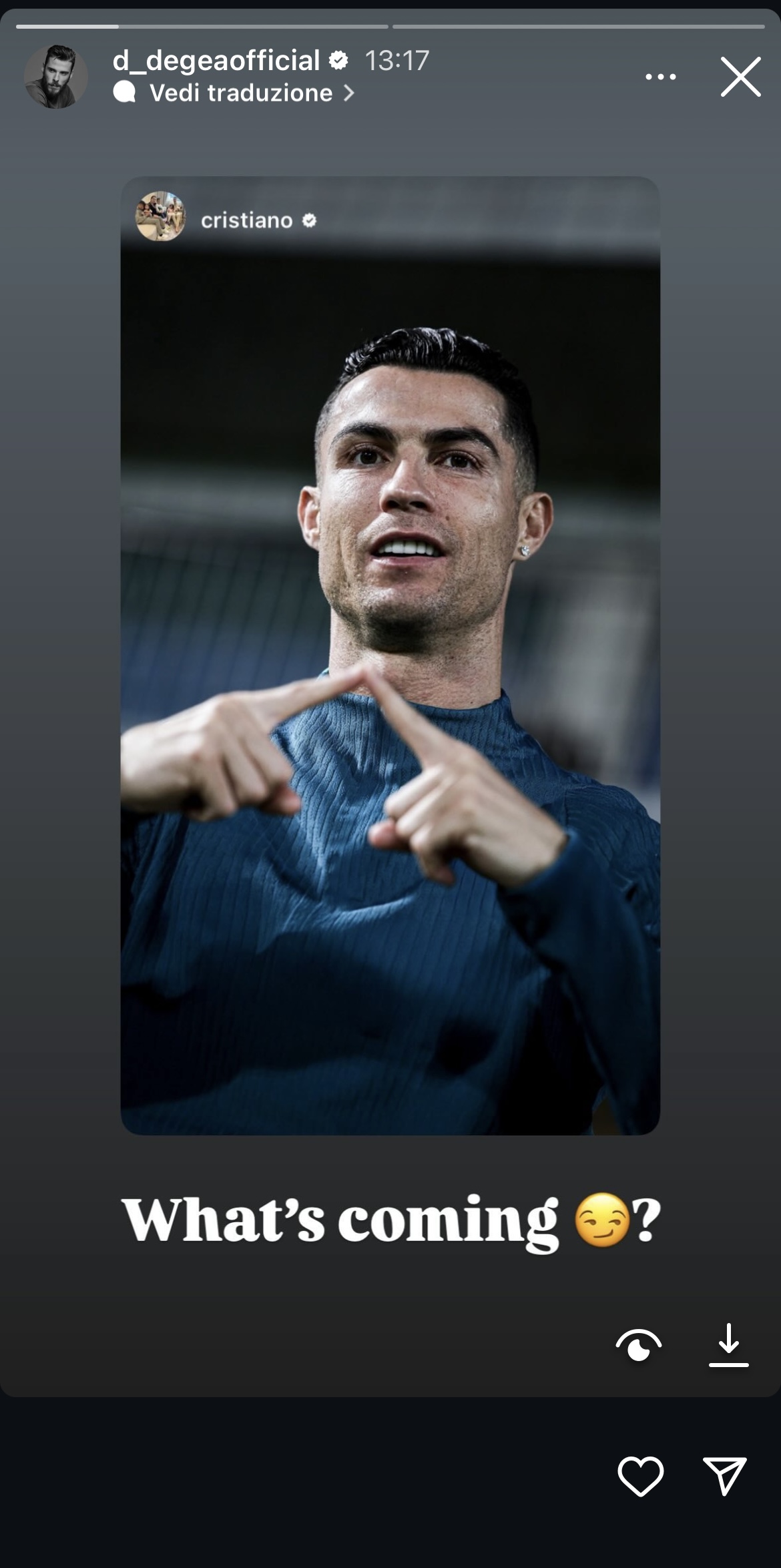 David De Gea scherza con Cristiano Ronaldo. I due sono amici dai tempi del Manchester United ed evidentemente non si sono persi di vista, tanto che il portiere della Fiorentina ha postato una storia, su Instagram, nella quale figura CR7 che mostra gli indici delle mani. "Cosa c'è in arrivo?" la didascalia aggiunta dallo spagnolo. Ricordiamo che il contratto di Ronaldo con l'Al-Nassr scadrà nel 2025.