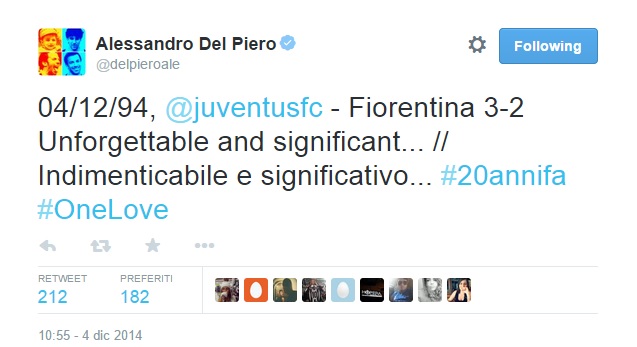 "04/12/94, @juventusfc - Fiorentina 3-2 Unforgettable and significant... // Indimenticabile e significativo... #20annifa #OneLove". Così Alessandro Del Piero, a 20 anni di distanza, ha voluto ricordare il suo gol alla Fiorentina in una delle gare più tristi per i viola contro la rivale di sempre.