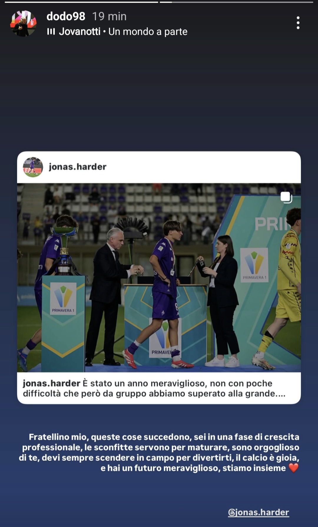 Ieri sera al Viola Park la Fiorentina primavera è stata sconfitta nella finale scudetto per 3-0 dall'Inter non riuscendo quindi a portare a casa un trofeo che a Firenze manca ormai dal 1983. Il centrocampista della formazione di Galloppa Jonas Harder ha commentato sui social la sconfitta con rammarico per l'impresa sfiorata e Dodo ha ripostato sui suoi profili Instagram il post del classe 2005 commentando: "Fratellino mio, queste cose succedono, sei in una fase di crescita professionale, le sconfitte servono per maturare, sono orgoglioso di te, devi sempre scendere in campo per divertirti, il calcio è gioia, e hai un futuro meraviglioso, stiamo insieme". Di seguito la storia Instagram di Dodo: