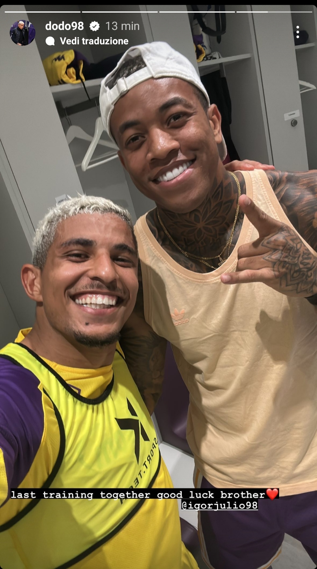 Il terzino della Fiorentina, Dodò, attraverso il proprio profilo Instagram ha salutato Igor. Il difensore ex SPAL infatti ha disputato oggi il suo ultimo allenamento in viola e partirà presto per l'Inghilterra direzione Brighton. Ecco le parole di Dodò: "Ultimo allenamento insieme, in bocca al lupo fratello".
