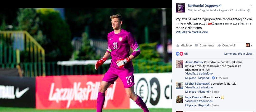 C'è anche il giovane portiere Bartlomiej Dragowski tra gli 11 giocatori della Fiorentina che in questa sosta di campionato sono stati convocati con le rispettive Nazionali. L'ex estremo difensore dello Jagellonia è stato chiamato dalla Polonia Under-21 con la quale disputerà nei prossimi giorni l'amichevole con la Germania. Ecco l'esultanza di Dragowski sui suoi social, tradotto in italiano: "In partenza per la Nazionale! Ogni convocazione è sempre un grande onore per me 🇵🇱 siete tutti invitati a vedere la partita contro la Germania".