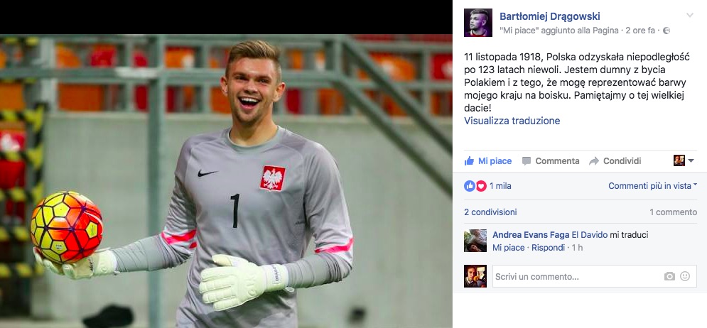 Il giovane portiere della Fiorentina Bartlomiej Dragowski, direttamente dal ritiro della Polonia, ha postato sulla sua pagina ufficiale Facebook un messaggio per ricordare un appuntamento molto importante del suo Paese: "11 novembre 1918, la Polonia ha riconquistato l'indipendenza dopo 123 anni di prigionia. Sono orgoglioso di essere polacco e di poter rappresentare in campo i colori del mio Paese. Ricordiamoci di questo grande evento!" è stato il testo pubblicato dall'estremo difensore viola, ancora alla ricerca dei suoi primi minuti in maglia gigliata.