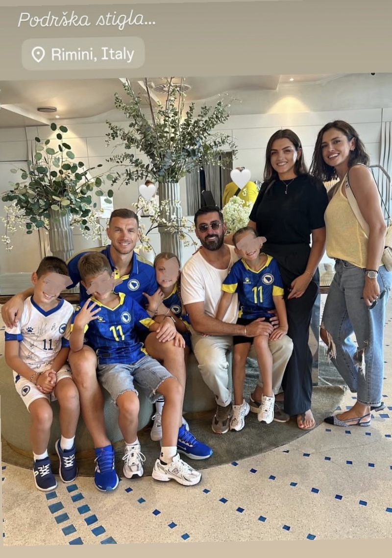 Stasera la Bosnia Erzegovina di Edin Dzeko ed Eman Kospo sarà di scena a San Marino alle 20.45, per la gara di qualificazione ai Mondiali. A fare il tifo per l'attaccante viola nel ritiro di Rimini sono arrivati anche la moglie, i figli e i suoi parenti. Foto di gruppo dunque nella hall dell'hotel dove alloggiano tutte le Nazionali di scena nel piccolo ma accogliente stato e stadio di San Marino. Ecco il gruppo-Dzeko nella foto postata sui social dalla moglie.