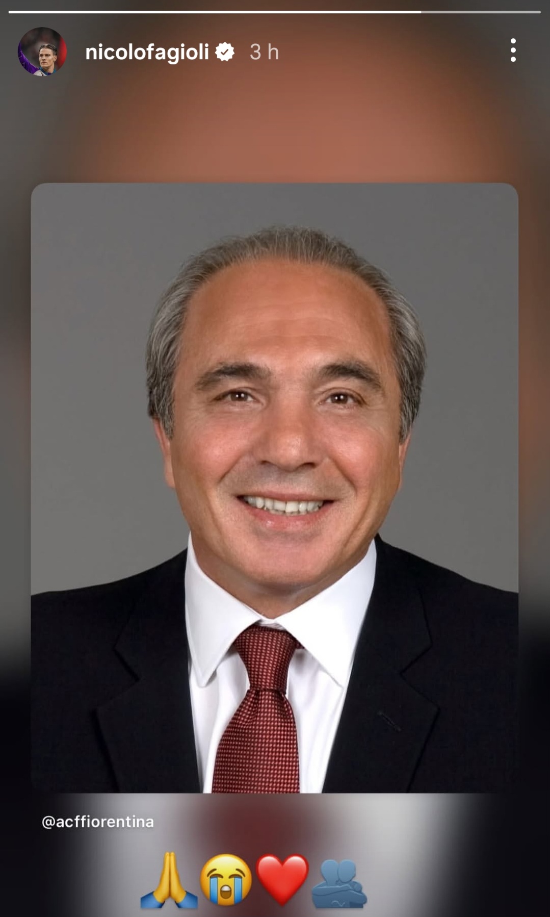 Tra le prime reazioni alla morte di Rocco Commisso, annunciata nella notte dalla Fiorentina attraverso un comunicato, c'è stata quella di Nicolò Fagioli, centrocampista viola. Il classe 2001 sul proprio profilo Instagram ha ricondiviso l'immagine e la notizia della scomparsa di Commisso mettendo a corredo una serie di emoji per esprimere il suo cordoglio. Ecco l'imm