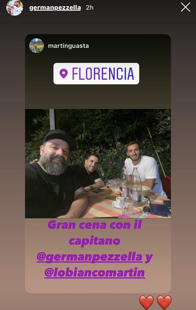 Il procuratore di German Pezzella, Martin Guastadisegno, è a Firenze. A testimoniare la notizia è lo stesso capitano viola che attraverso il suo account ufficiale Instagram ha ripostato una storia del suo agente che ritrae i due durante una cena proprio nel capoluogo toscano. Di seguito la foto originale