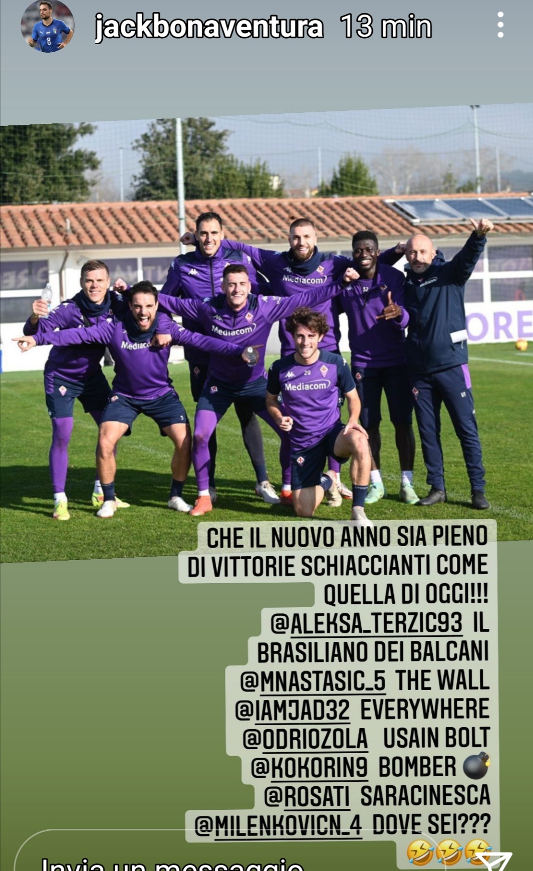 Questa mattina c'è stato l'ultimo allenamento del 2021 da parte della Fiorentina con l'immancabile e sentitissima sfida dell'anno tra i viola. A vincere la squadra di Jack Bonaventura che oltre ad esultare con la frase "Che il nuovo anno sia pieno di vittorie schiaccianti come quella di oggi" tagga i compagni di avventura nella foto di gruppo. Con tanto però di soprannomi per tutti. Così Terzic è il brasiliano dei Balcani, Nastasic The wall, Duncan Everywhere, Odriozola Usain Bolt, Kokorin è il bomber, Rosati la Saracinesca. Mentre sfugge alla foto Milenkovic "Dove sei?" gli scrive il compagno. Un modo carino per salutare il 2021 in allegria e fare gruppo.