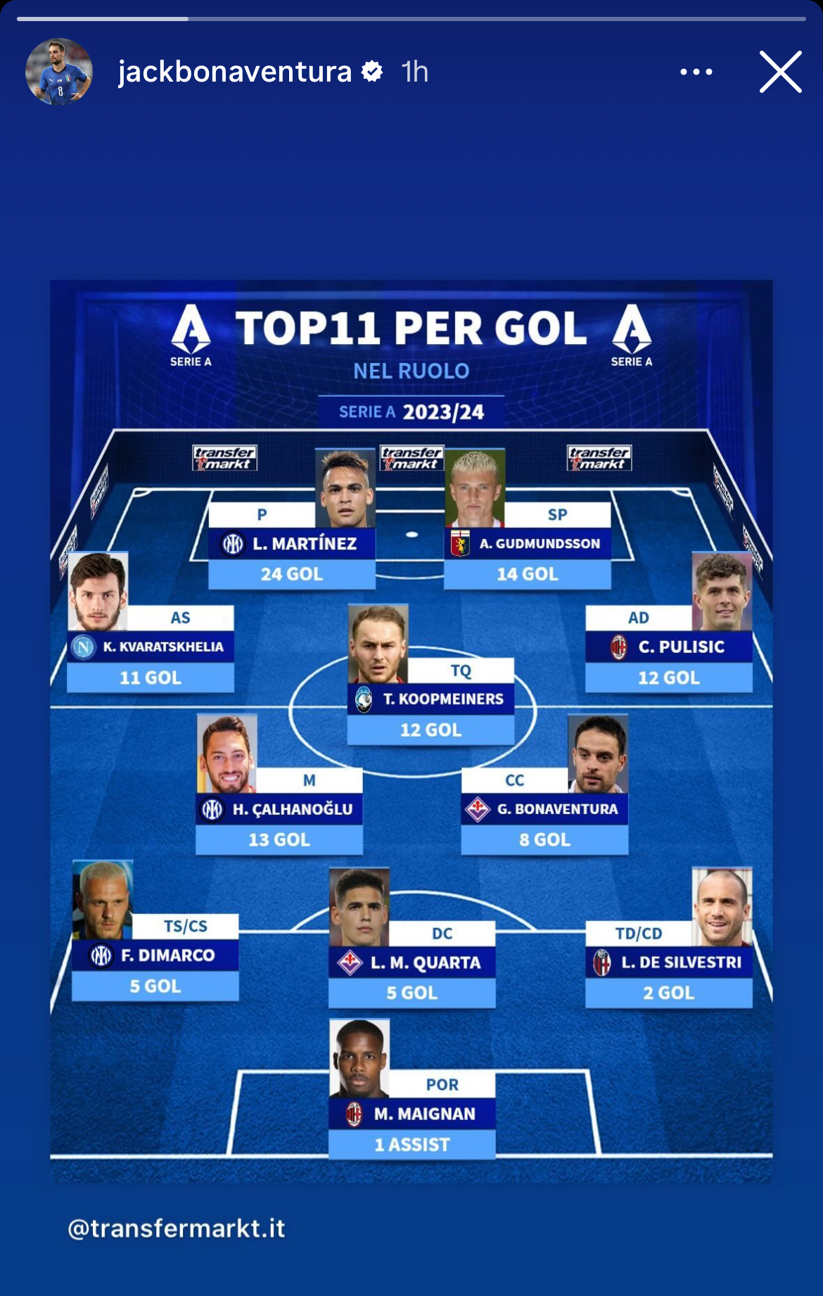 Giacomo Bonaventura è stato inserito nella top 11 gol suddivisa per ruoli realizzato dal noto portale di statistica Transfermarkt. Lo stesso centrocampista viola ha pubblicato sui propri social la formazione che lo vede in mezzo al campo con i suoi 8 gol realizzati in stagione. Meglio di lui, nella stesso ruolo, hanno fatto solo Koopmeiners e Chalanoglu con rispettivamente 12 e 13 gol. Qui sotto la top 11 dove oltre a Bonaventura, è presente anche Martinez Quarta in difesa con 5 reti.