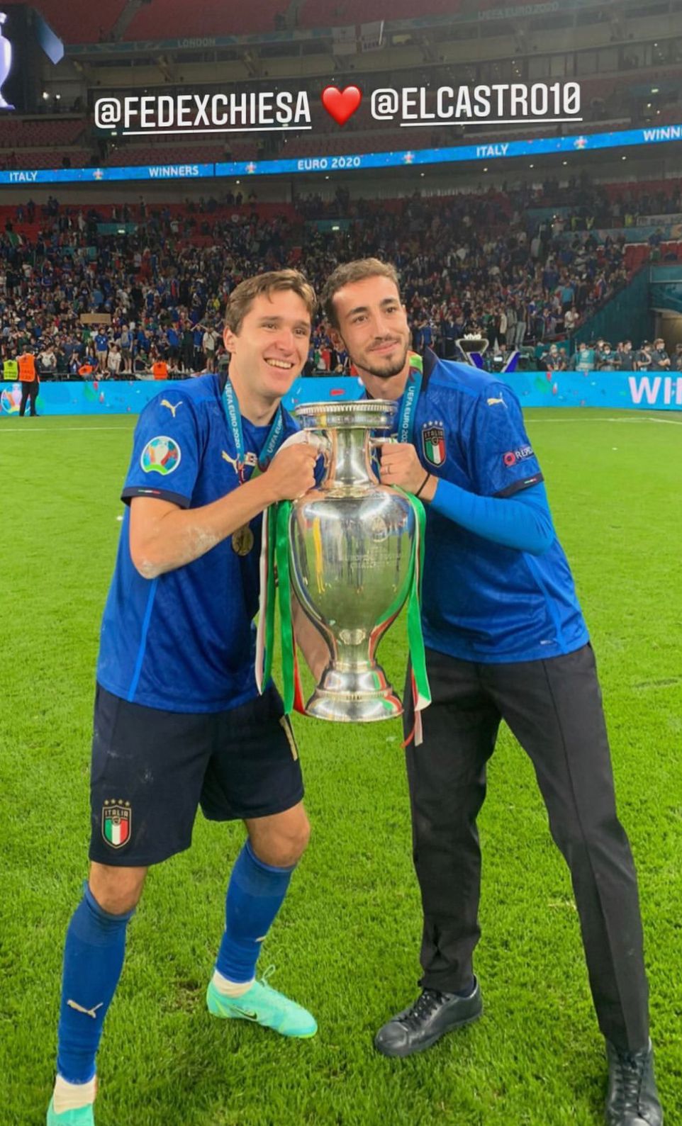Ex compagni ed amici al di là dei colori, per una sera compagni azzurri e campioni d'Europa insieme, pur con un percorso diverso. Ex compagni nella Fiorentina, Federico Chiesa è stato protagonista dell'Europeo, Gaetano Castrovilli ha fatto parte del gruppo solo al foto finish ed ha visto quasi tutte le partite dalla tribuna ma in questa serata al Wembley nel gruppo non esistono distinzioni: tutti sono 26 titolari, tutti sono sul tetto d'Europa. Così i due ex compagni viola posano insieme con la Coppa, felici come non mai. Ecco la foto postata nelle storie di Benedetta, la fidanzata di Chiesa.