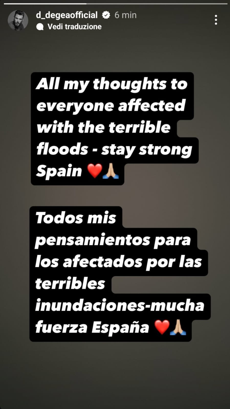 "Il mio pensiero oggi va a tutti quelli che sono stati colpiti da queste tremende alluvioni. Forza Spagna, sono con te". Così, David De Gea, attraverso il suo profilo Instagram, ha voluto esprimere la sua solidarietà ai propri connazionali colpiti duramente dalle forti piogge delle ultime ore. In particolare, alcune zone della Spagna, ad esempio Valencia, sono in ginocchio. Acausa dell'alluvione che sta colpendo parte della Spagna, la federcalcio iberica (Rfef) ha deciso di rinviare due incontri del primo turno della Coppa del Re, in programma oggi. Si tratta di Parla Escuela-Valencia che doveva giocarsi a Madrid e Pontevedra-Levante. Le due gare dovrebbero essere recuperate la settimana prossima. Per tutte le partite che si giocheranno oggi è stato deciso un minuto di silenzio.