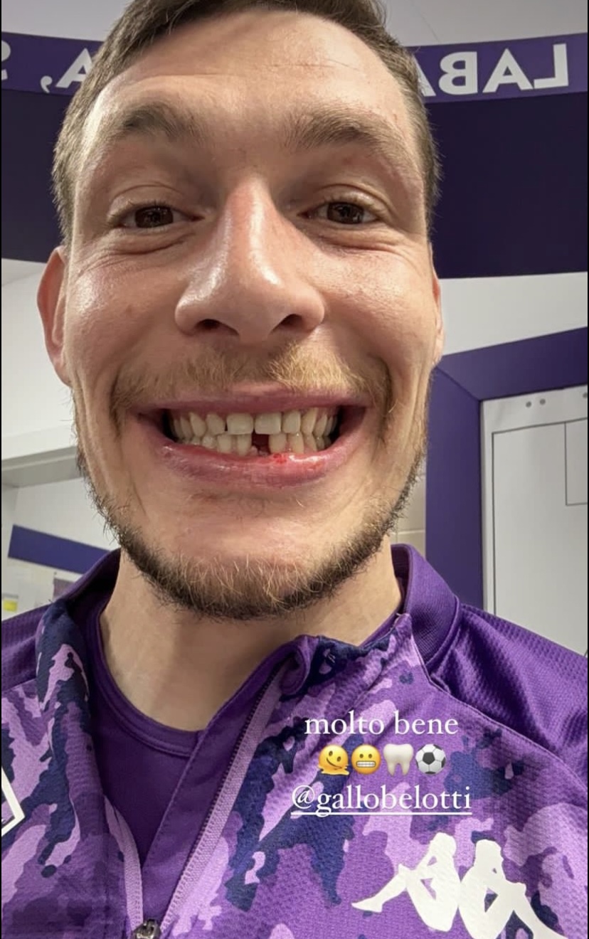 Brutta disavventura per Andrea Belotti nel finale della gara con l'Atalanta. Quando è uscito dopo uno scontro di gioco è dovuto ricorrere alle cure del dottore che gli ha subito messo un tampone in bocca. La moglie Giorgia mostra il risultato, ossia un dente rotto.