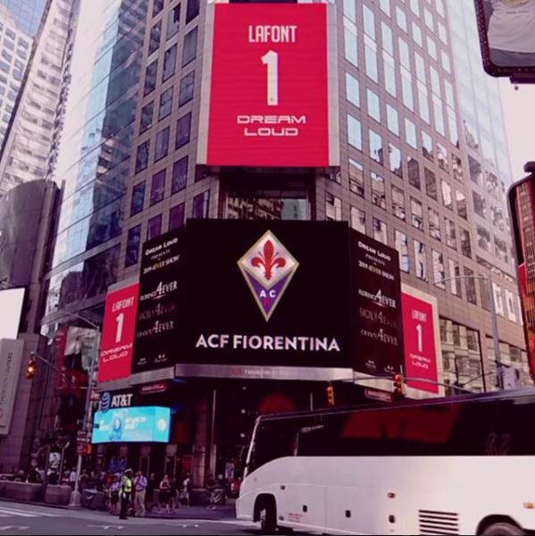 La Fiorentina e il suo numero uno Lafont esposti a Times Square, una delle piazze più celebri ed iconiche nell'intera New York. No, non è una tournée a sorpresa in suolo statunitense, bensì la nuova campagna di Dream Loud, retro-sponsor della squadra in maglia viola. Come si vede dalla foto pubblicata sui profili social della compagnia, nella famosissima piazza di New York la base di un grattacielo mostra lo stemma della Viola. Qualche metro più su, c'è spazio anche per la maglia rossa del giovane portiere francese. Di seguito ecco dunque la foto tratta da Instagram: