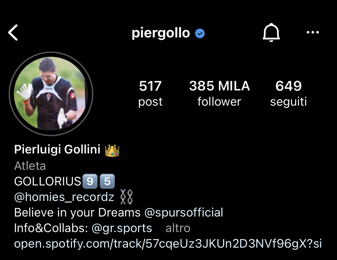Ritorno all'antico per il nuovo portiere della Fiorentina Pierluigi Gollini: l'estremo difensore, che oggi ha sostenuto le viste mediche a Firenze, ha infatti da poco aggiornato la sua immagine-profilo su Instagram scegliendo uno scatto che lo ritrae con la maglia gigliata nella stagione 2010-11, quando giocava negli Under-17. Ecco un dettaglio del nuovo profilo del classe '95:
