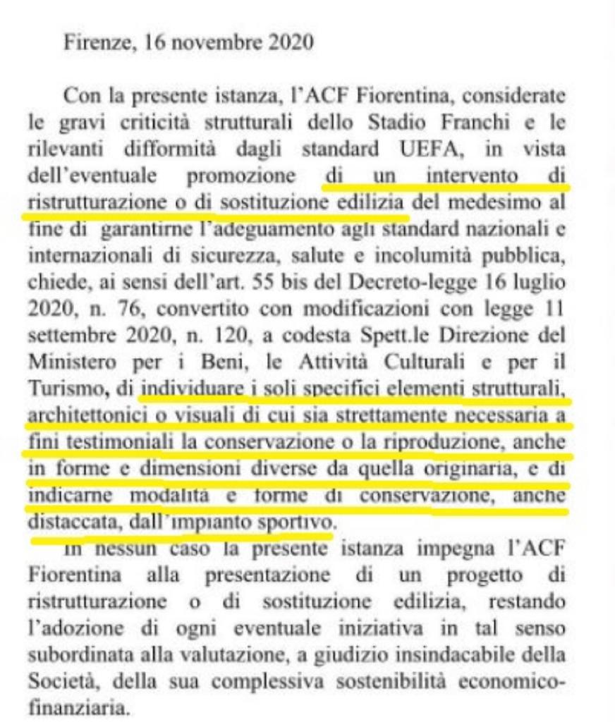 FOTO, Ecco la lettera di ACF al Mibact per il Franchi