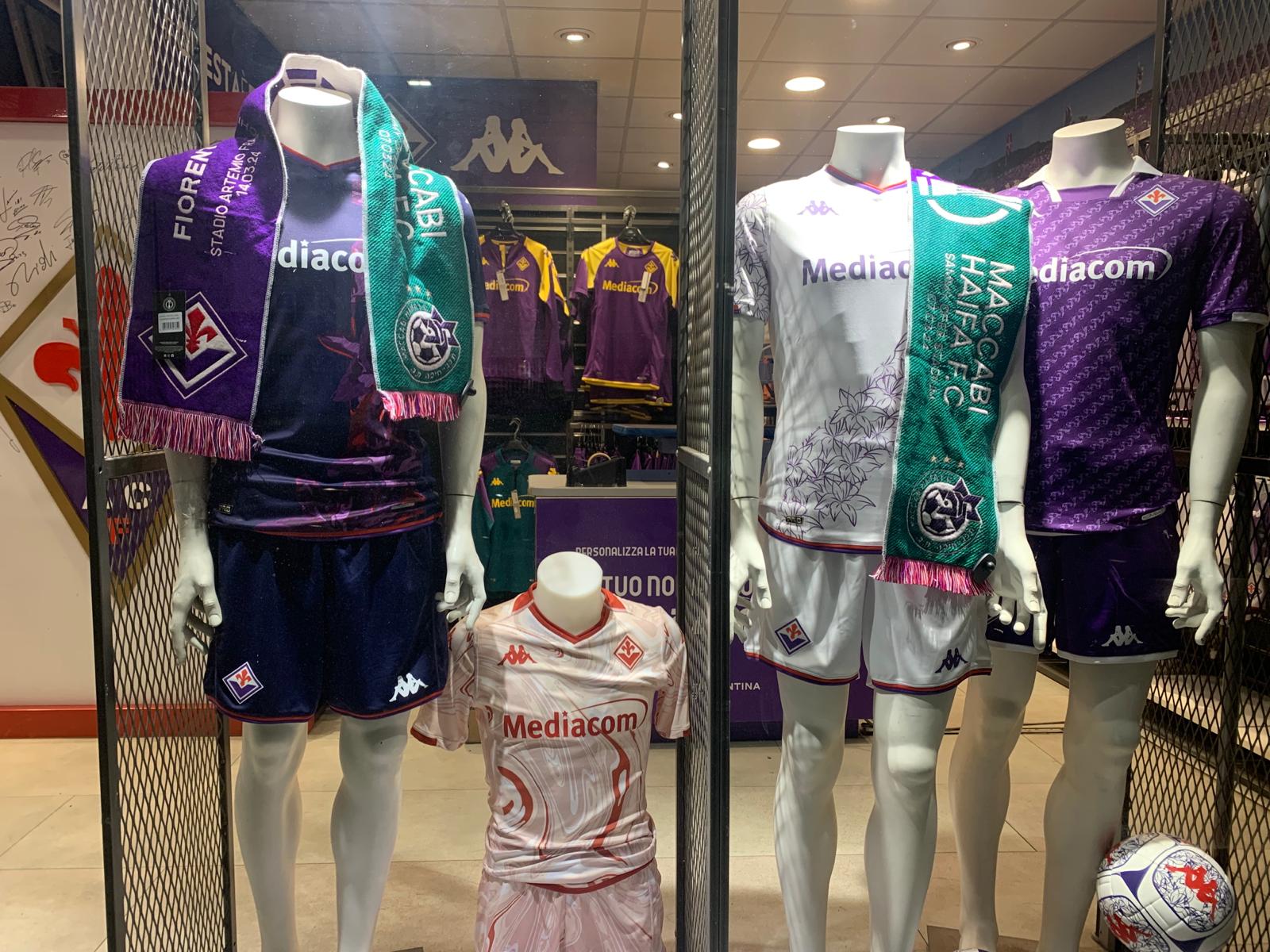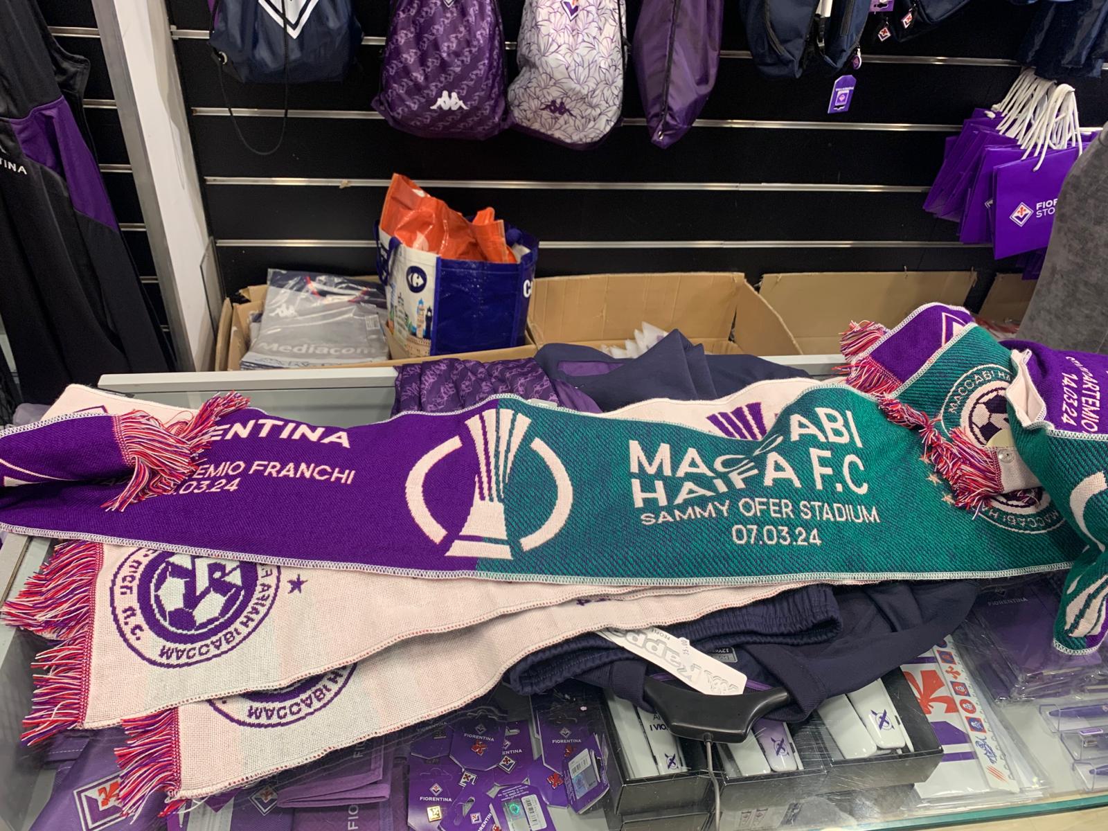 Negli store ufficiali della Fiorentina sono disponibili le sciarpe celebrative degli ottavi di finale di Conference League tra i viola e il Maccabi Haifa. Queste le foto realizzate da FirenzeViola.it.
