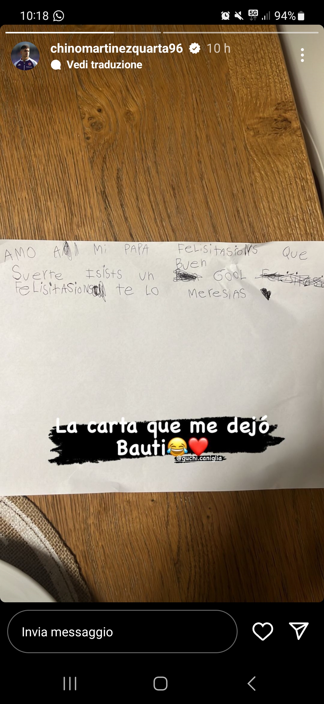 Una dolce previsione che si è rivelata giusta, rivelata da Lucas Martinez Quarta sul proprio account Instagram dopo la partita vinta contro il Genk grazie anche ad un suo gol. Il figlio Bautista gli aveva lasciato un biglietto prima della partita con su scritto: "Ti amo papà. In bocca al lupo e spero in un bel gol. Te lo meriti". Detto, fatto.