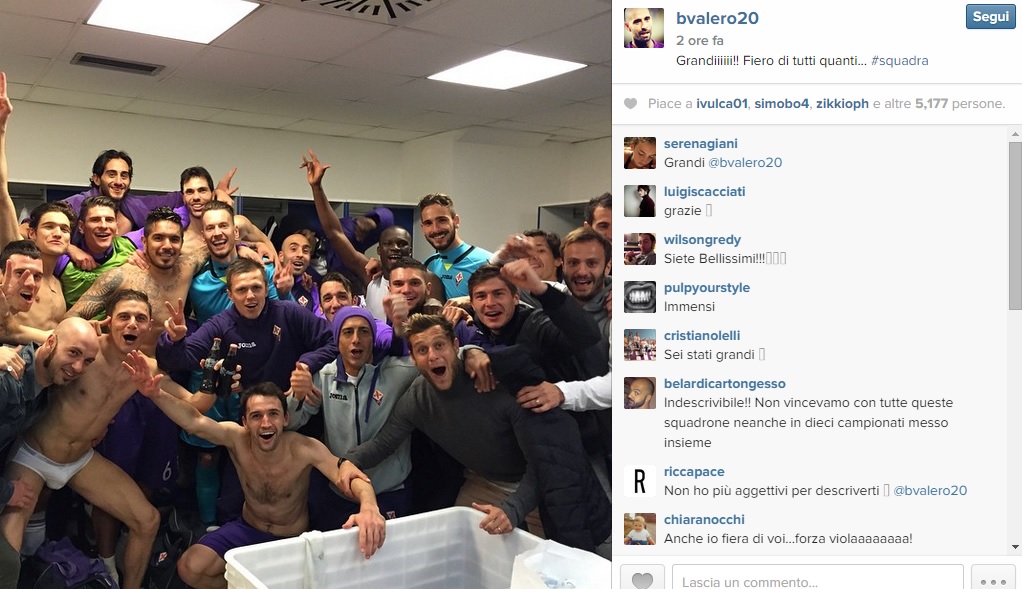 Grande gioia dopo il successo in Europa League contro la Roma. Non solo fra i tifosi, ma anche fra i giocatori, che nello spogliatoio si sono lasciati andare. Questa la foto postata da Borja Valero sul suo profilo Instagram che immortala la gioia del gruppo nello spogliatoio.