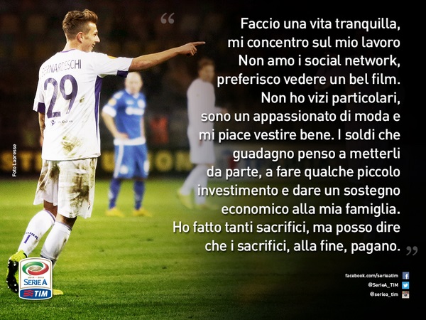 "L'umiltà di#Bernardeschi, il talento dell'@acffiorentina che ha incantato l'#Italia e ha fatto innamorare #Firenze": questo il post pubblicato sul proprio profilo Twitter dalla Lega Serie A, che esalta il magico momento del giovane attaccante viola Federico Bernardeschi, a segno con la maglia della Nazionale italiana Under 21 contro lo Slovacchia nel match di due giorni fa. Nella foto allegata, si riportano anche delle dichiarazioni rilasciate dal talento di Carrara riguardo ai sacrifici e alla famiglia.