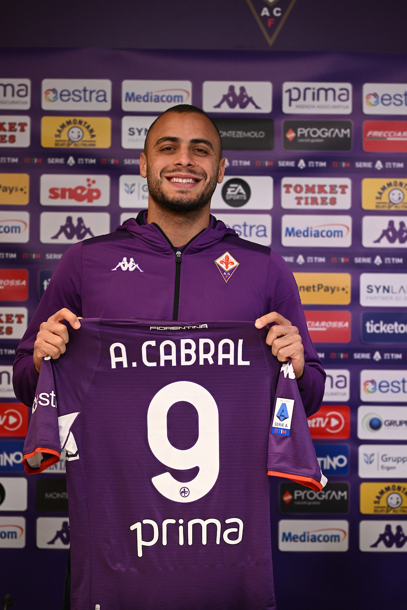 Nel primo pomeriggio Cabral è stato presentato dal direttore sportivo Daniele Pradè. Ecco le immagini, scattate dalla Fiorentina, del giocatore in posa con la maglia numero 9 e con il ds viola.