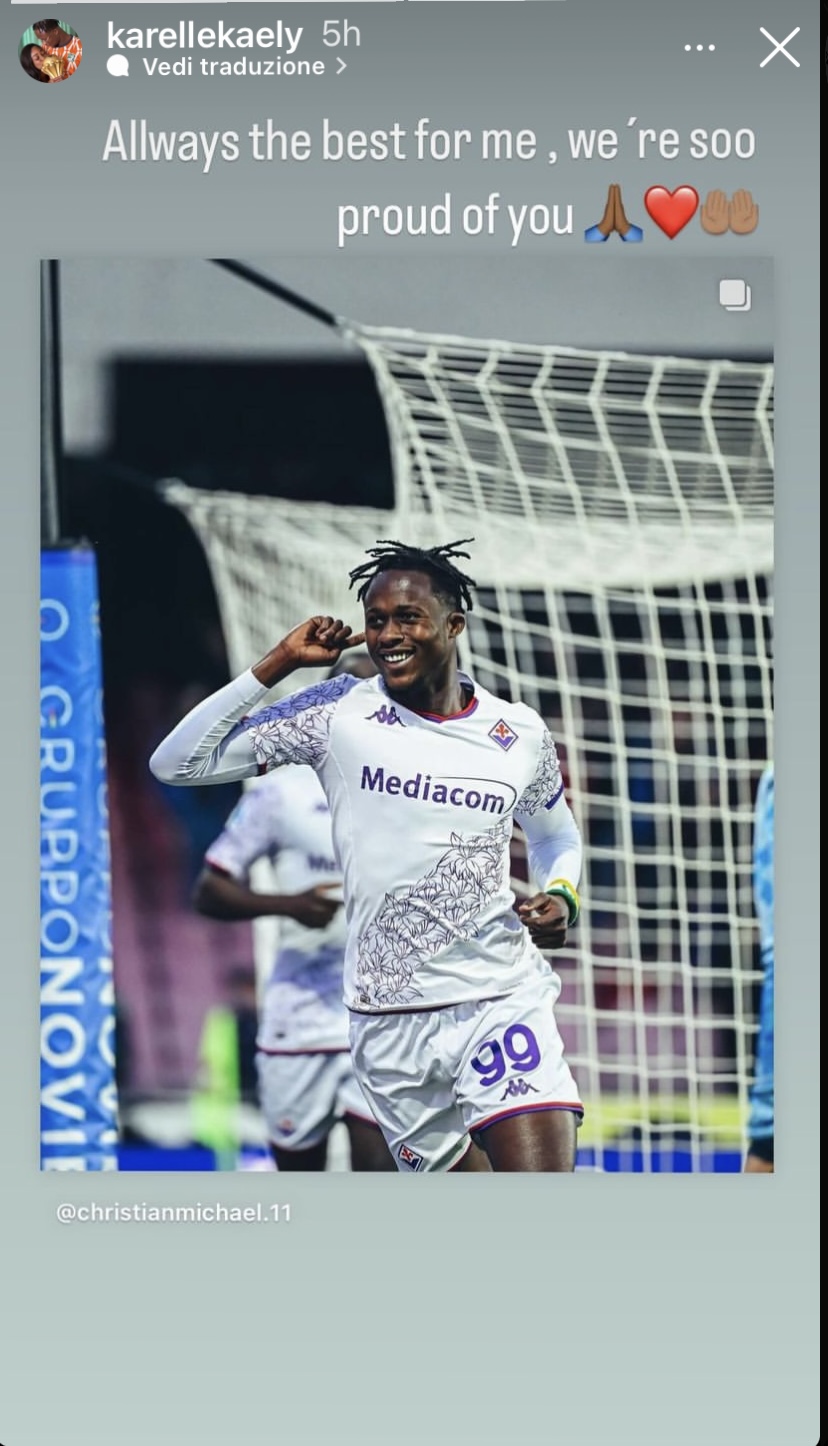La moglie di Christian Kouame, Karelle, pubblica la foto del giocatore con un bel messaggio a lui dedicato. Il morale dei viola non è certo al massimo e sicuramente al giocatore, che ha avuto anche una buona occasione, sono arrivate anche molte critiche come ai compagni: "Sempre il migliore per me. siamo così orgogliosi di te" scrive nel post su Instagram in un abbraccio virtuale e consolatorio al marito.