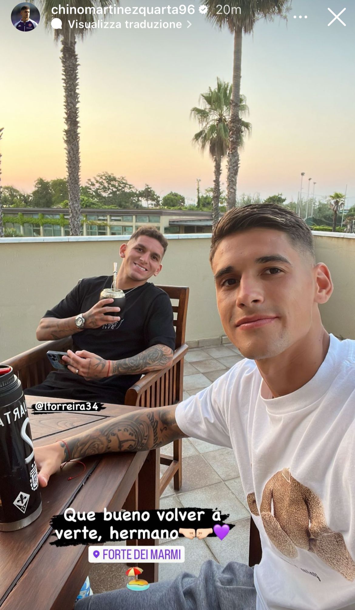 In attesa di partire per la Tournée in Austria, durante la quale la Fiorentina sfiderà il Galatasaray e la nazionale del Qatar, i calciatori viola si riposano. Come testimonia una storia postata sul proprio profilo Instagram, Quarta sta passando la propria serata in compagnia dell'ex compagno di squadra Torreira. I due come spesso già mostrato stanno bevendo insieme il Mate, la famosa bevanda sudamericana, nella famosa località di Forte dei Marmi.