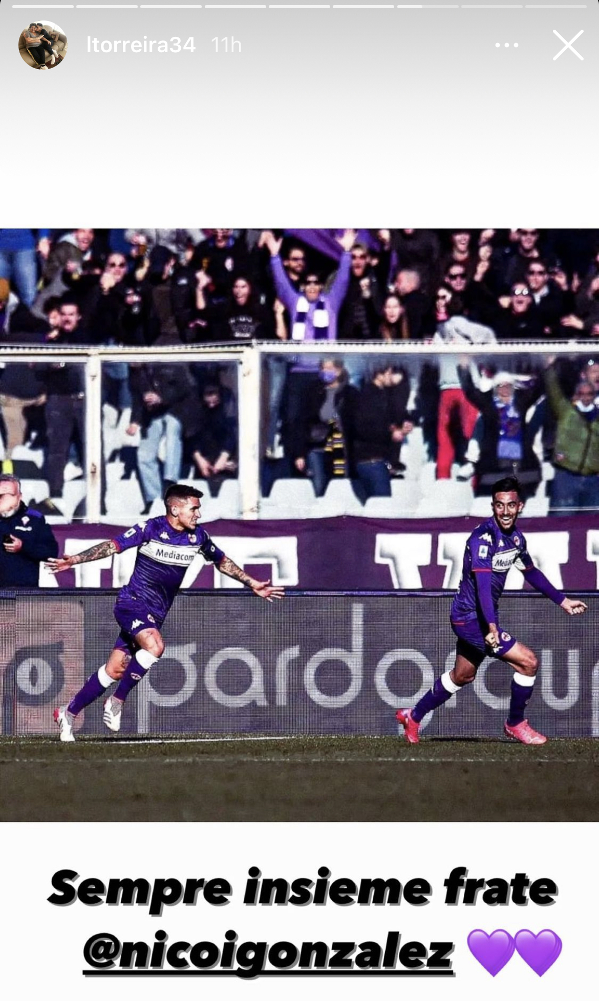 C'è tanta voglia di riprendere il prima possibile a lavorare in casa Fiorentina: dopo le vacanze natalizie infatti il gruppo viola sarà già al lavoro per preparare la sfida del 6 gennaio contro l'Udinese ma c'è chi - come Torreira, che avrà qualche ora in più di libertà - non sta più nella pelle. A testimoniarlo è una storia pubblicata su Instagram che lo ritrae assieme a Gonzalez nel corso di un'esultanza dopo un gol dell'argentino: "Sempre insieme frate", il commento in italiano dell'ex Arsenal. Ecco la foto dei due giocatori, pronti a far esaltare ancora il popolo viola a partire dal match dell'Epifania: