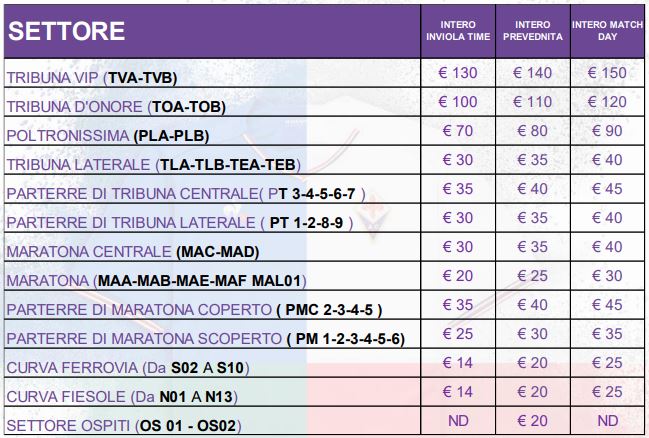 ACF Fiorentina informa i propri tifosi che i biglietti per la gara contro il Lecce, in programma per sabato 30 novembre alle ore 20:45, saranno in vendita a partire da lunedì 11 novembre. Questa la tabella con i prezzi completi, che spaziano dai 20 euro per le curve fino ai 140 per la tribuna vip.