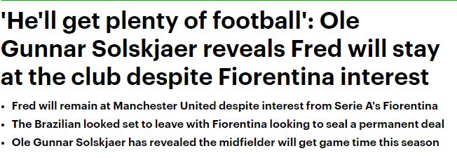 Fred, centrocampista brasiliano ex Shaktar Donetsk e ora al Manchester United, è stato nei pensieri della Fiorentina per la squadra gigliata, ma come rivela il Daily Mail il tecnico dei Red Devils Ole Gunnar Solskjaer ha deciso di trattenerlo in Inghilterra e non farlo partire. Il giocatore, pagato 52 milioni di sterline, fatica ad imporsi in Premier League ma la scelta dell'allenatore è chiara e non ammette cambiamenti.