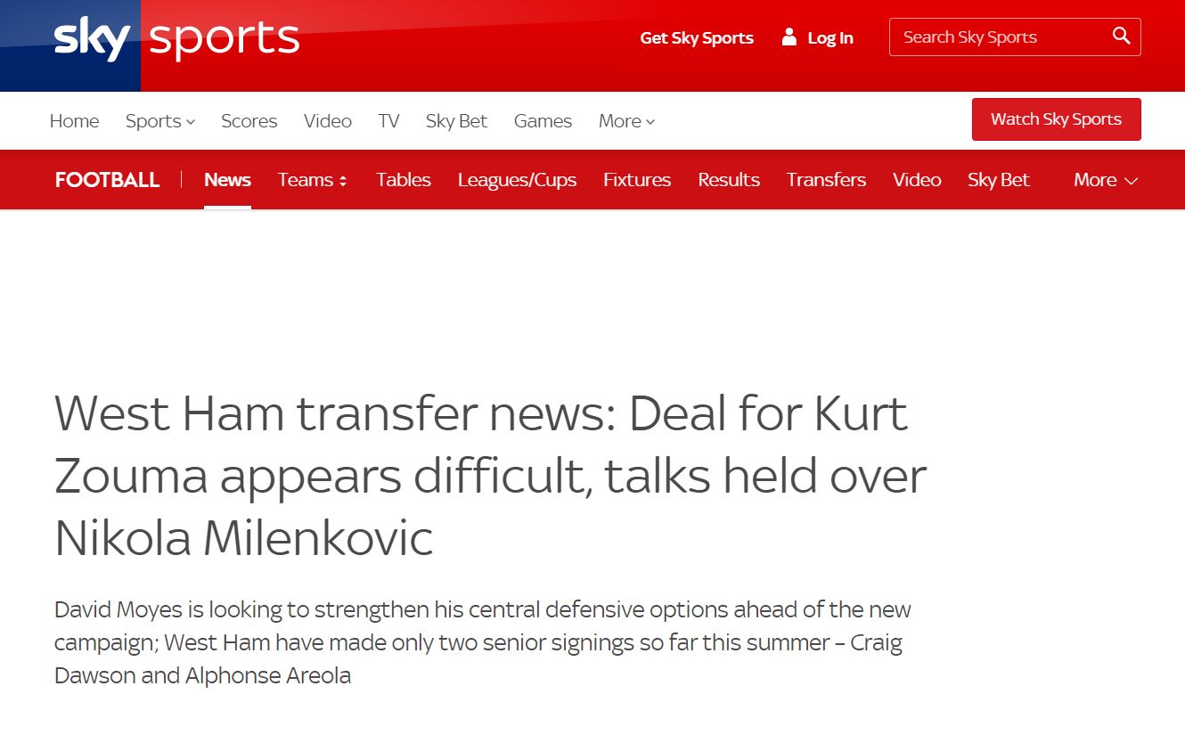 SKY SPORTS UK, Il West Ham su Milenkovic