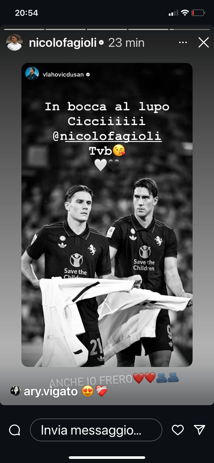 Con un messaggio pubblicato su Instagram (qui il post) Nicolò Fagioli ha salutato la Juventus dopo undici anni tra giovanili e prima squadra. Oltre ai tanti commenti ricevuti da tifosi bianconeri, che hanno dimostrato tanto affetto per il nuovo centrocampista della Fiorentina, anche un in bocca al lupo speciale di uno che a Firenze ci è passato prima di trasferirsi in bianconero. Si tratta di Dusan Valhovic, che ha condiviso una storia con una foto che raffigura entrambi, il numero nove della Juve e il suo ex compagno, scrivendo "In bocca al lupo Cicci, tvb". Commento a cui Fagioli ha risposto con un "Grazie frero", a testimonianza della grande amicizia stretta in questi anni tra i due, figlia del rapporto nato in campo ma anche fuori.
