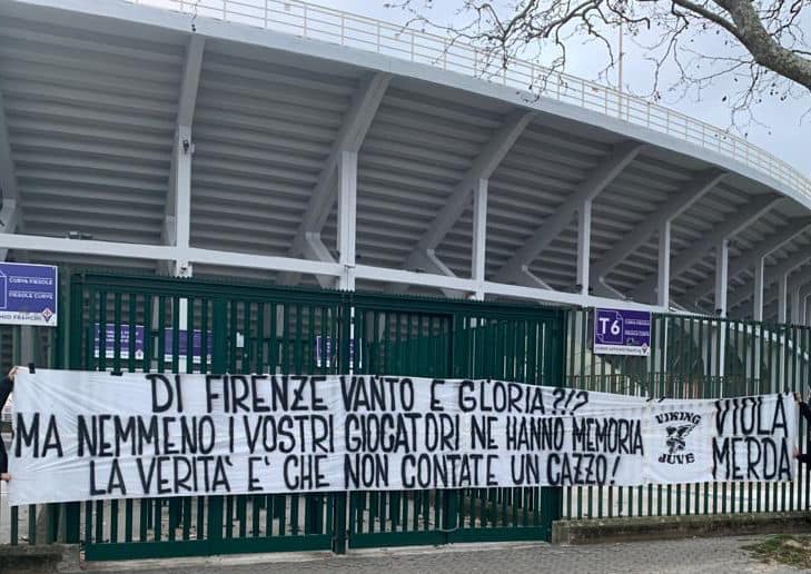 "Di Firenze vanto e gloria?!? Ma nemmeno i vostri giocatori ne hanno memoria. La verità è che non contate un c***o!". Questo il messaggio contenuto su uno striscione esposto (non appeso) stamani al Franchi, sotto il T6, la cui foto è stata pubblicata dal gruppo Ultras della Juventus Viking Juve 1986. Ecco l'immagine: