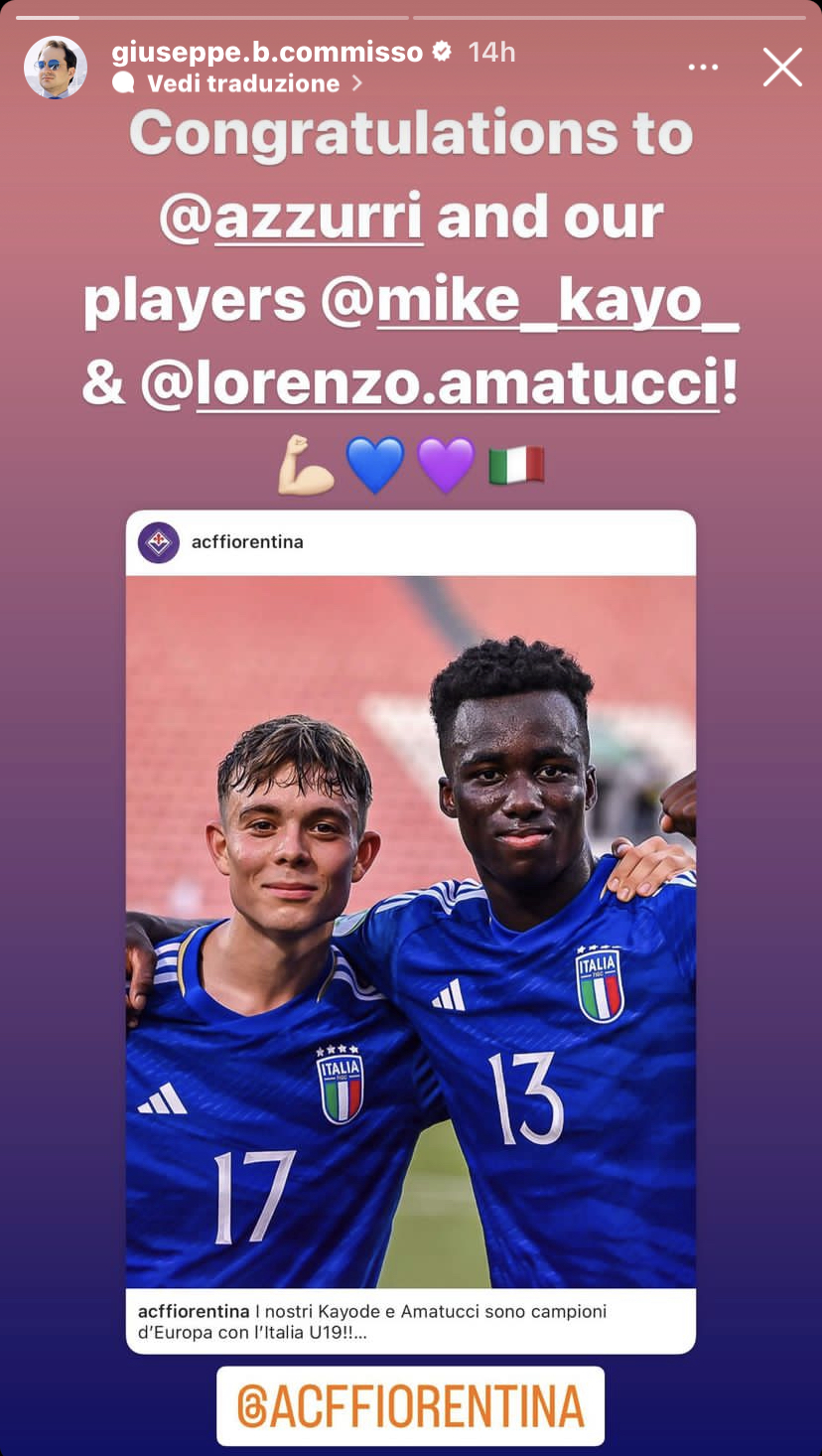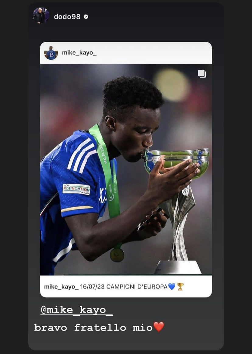 Nella serata di ieri, con il decisivo che ha regalato all'Italia Under 19 la vittoria dell'Europeo, Mike Kayode è entrato nella storia. Inevitabili, al termine della partita, tutti i complimenti, anche via social, al terzino della Fiorentina. Tra questi anche quelli di Dodò: "Bravo fratello mio", Ikoné, Saponara e del figlio di Commisso, Joseph. Qui sotto le immagini raccolte su Instagram.