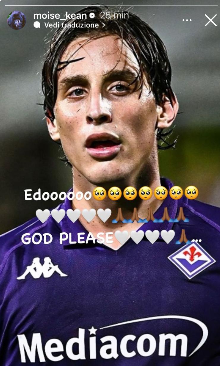 Tra i tanti messaggi arrivati in sostegno a Edoardo Bove è arrivato anche quello del bomber viola Moise Kean, che come De Gea ha rivolto direttamente una preghiera al cielo. "Dio, ti prego", il messaggio dell'attaccante, che in una recente intervista aveva dichiarato di essere molto credente.