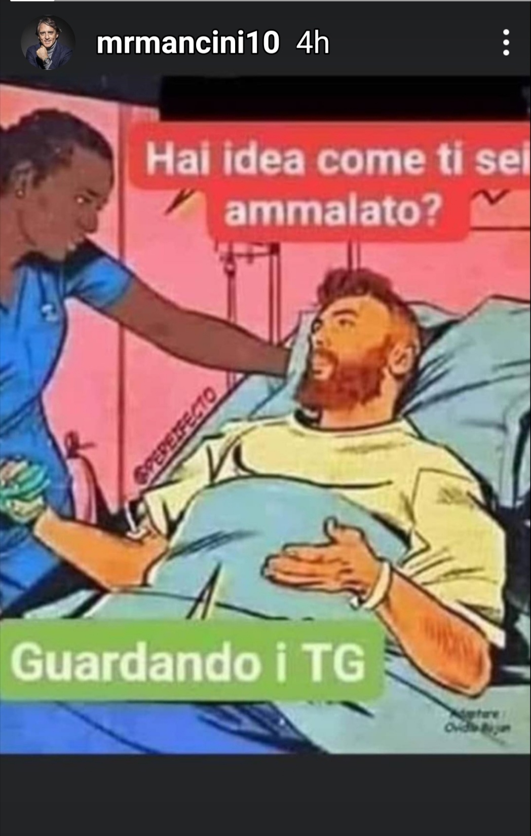 Il ct della Nazionale Roberto Mancini pubblica sulle storie di Instagram una vignetta ironica in cui un malato al quale viene chiesto dove si sia ammalato risponde "Guardando i Tg" e scatena una serie di critiche e polemiche. La vignetta, che esprime evidentemente un certo dissenso dal clima di terrore generato, viene considerata dai più poco rispettosa per le vittime del Coronavirus. "Soprattutto dopo che hai giocato a Bergamo" commenta qualcuno. In molti gli fanno notare come un'uscita del genere sia fuoriluogo per un ct "Qualcuno gli faccia notare che non è in una chat di amici" suggeriscono via Twitter. Ma nonostante questo la vignetta non è stata ancora rimossa. Il ct già in conferenza pre Moldavia aveva risposto per le rime al ministro Speranza "Ci sono altre priorità rispetto al calcio, come la scuola? Io penso che qualche volta bisognerebbe pensare prima di parlare. Lo sport è un diritto per tutti gli italiani ed è una priorità come lo sono la scuola e il lavoro, milioni di italiani praticano sport ad ogni livello” aveva detto.