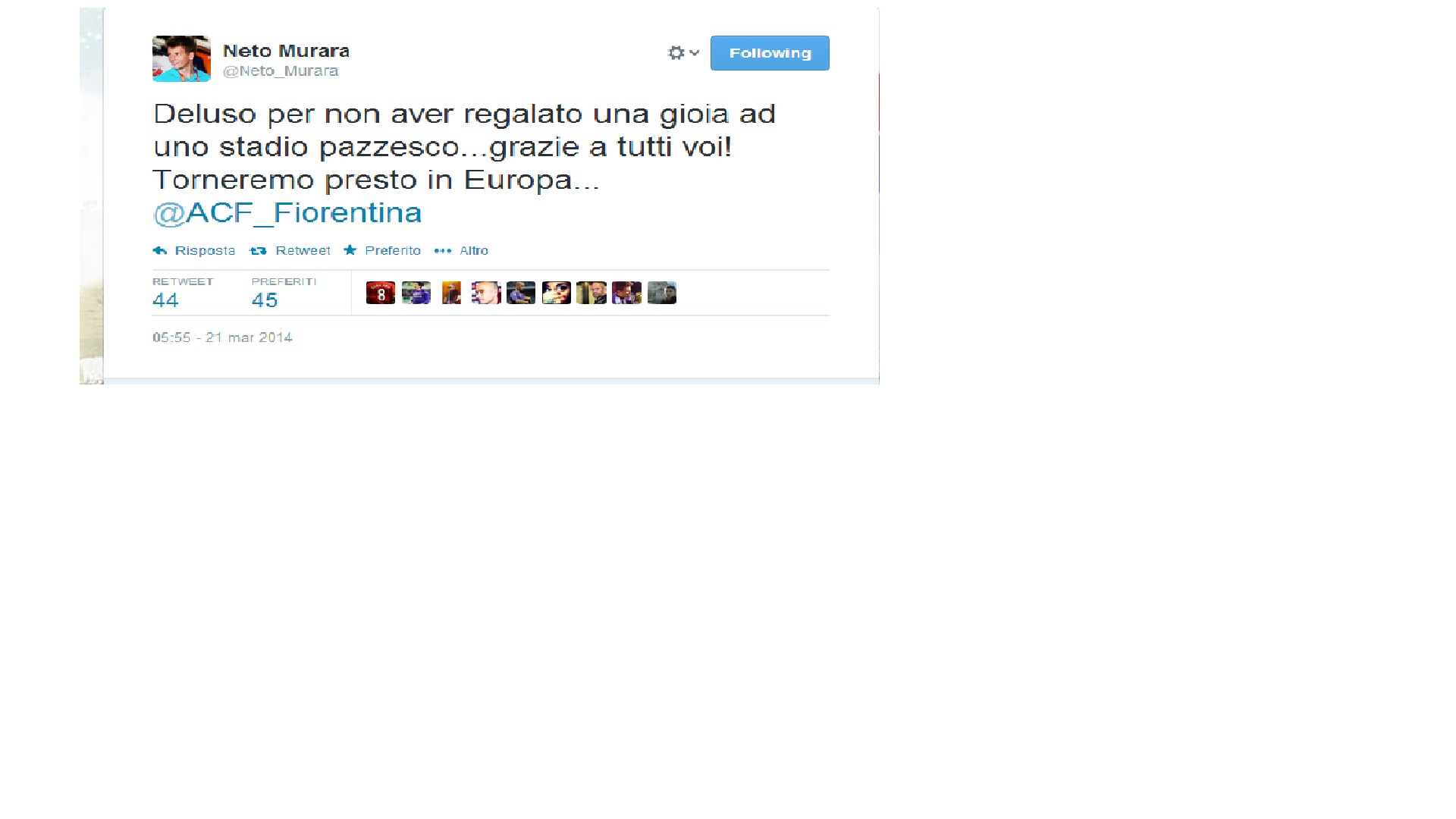 "Deluso per non aver regalato una gioia ad uno stadio pazzesco...grazie a tutti voi! Torneremo presto in Europa... @ACF_Fiorentina". Questo il post apparso pochi minuti fa sul profito Twitter ufficiale di Norberto Murara Neto. Il portiere viola, anche nella gara di ieri si è reso protagonista di alcune parate che hanno permesso alla Fiorentina di tenere viva la speranza di passare il turno, spezzata poi dal gol di Pirlo e dal triplice fischio dell'arbitro Webb.