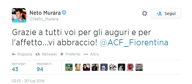 Dopo la torta, la canzone di Gonzalo, ed i tanti auguri ricevuti, il portiere brasiliano Neto ha voluto ringraziare tutti per l'affetto ricevuto per il suo compleanno. Questo il messaggio apparso sul profilo Twitter dell'estreno difensore viola: " Grazie a tutti per gli auguri e per l'affetto, vi abbraccio!"