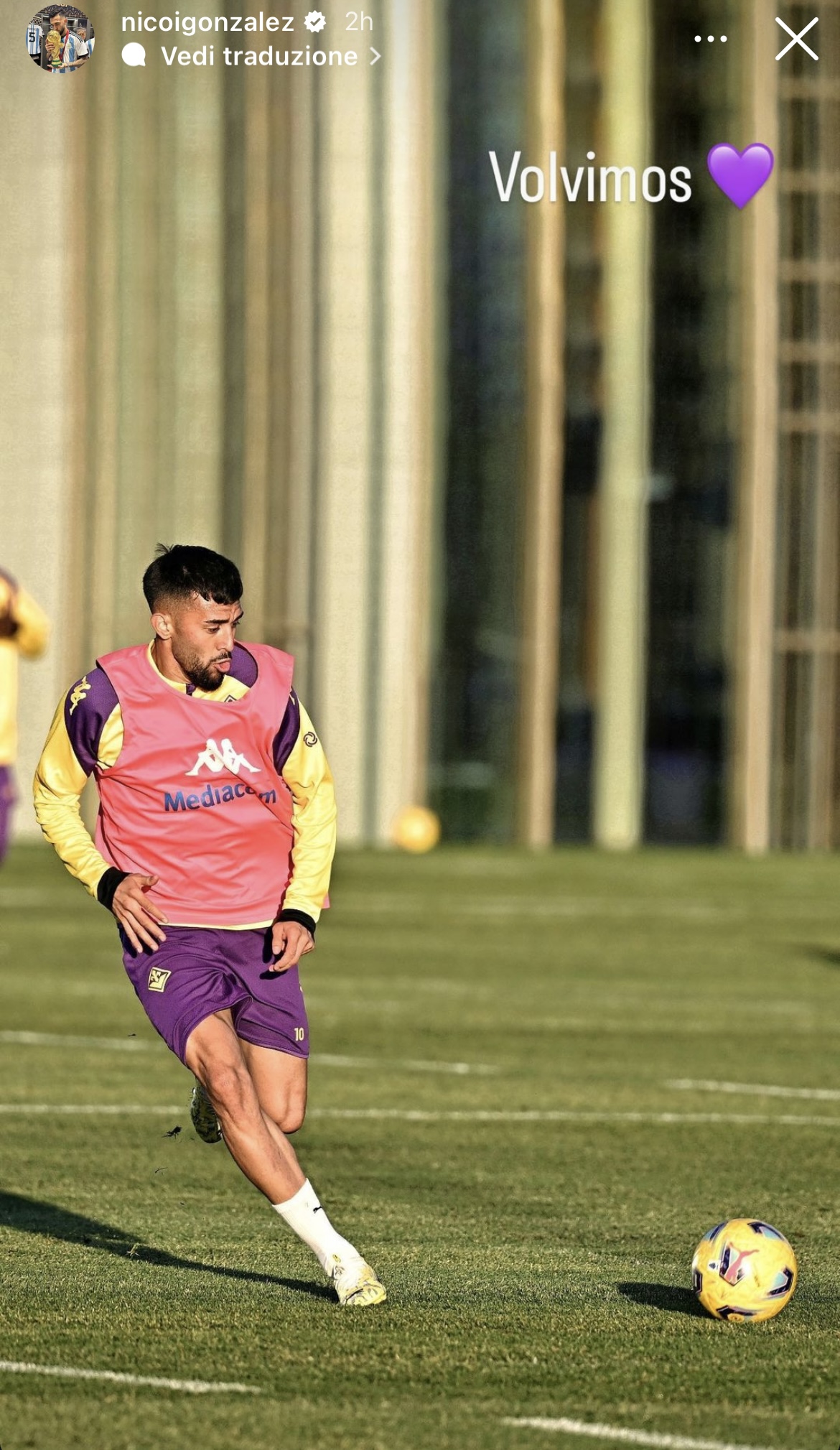 Rientrato dagli impegni con la propria nazionale, Nico Gonzalez, si è oggi allenato con la squadra ed ha postato sulle proprie storie Instagram una foto dell'allenamento con scritto: "Volvimos" ovvero "Siamo tornati", caricandosi in vista della gara contro il Milan, in programma per questo sabato. Di seguito la storia dell'esterno argentino: