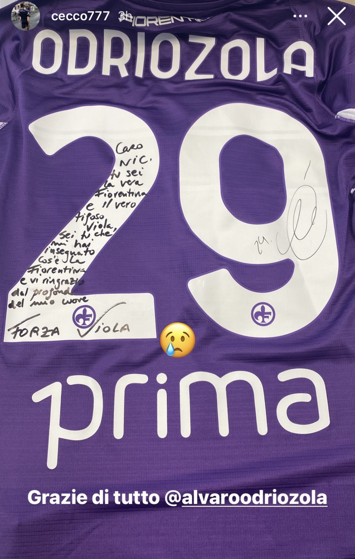 Nicola Cecconi, dipendente della Fiorentina che si occupa della logistica della prima squadra, ha mostrato una maglia regalatagli da Alvaro Odriozola. E' stato proprio lui a pubblicare (e poi cancellare) sul suo profilo Instagram il regalo che il basco gli ha fatto, ovvero una sua maglia col numero 29 e una lunga dedica: "Caro Nic" - si legge - "tu sei la vera Fiorentina e il vero tifoso viola, sei tu che mi hai insegnato cos'è la Fiorentina e ti ringrazio dal profondo del mio cuore. Forza Viola". Cecconi ha postato la maglia con l'eloquente commento: "Grazie di tutto Alvaro" e un emoticon triste.