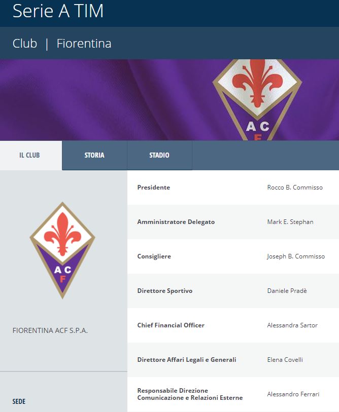 Presidente Rocco Commisso, amministratore delegato Mark E. Stephan, Joe Commisso (il figlio del Presidente) consigliere e naturalmente Daniele Pradè direttore sportivo. Sono queste le principali novità nell'organigramma della Fiorentina, almeno provvisoriamente, in attesa di un CdA e secondo la pagina della Lega con i dati del club viola. Per il nome dell'amministratore delegato dunque Commisso ha scelto tra i suoi dirigenti americani, fidati, della Mediacom dove Stephan ha ricoperto più ruoli, fino a vicepresidente esecutivo. Il manager è stato presente anche agli incontri che Commisso ha avuto nel suo ultimo soggiorno a Firenze (nella foto è il primo a sinistra) ed ha incontrato alcune figure per il "casting" di manager da far entrare nel club.