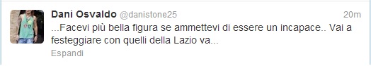 Pablo Daniel Osvaldo, su Twitter, accusa duramente: l'impressione è che il tweet, arrivato in questi istanti, sia un durissimo attacco nei confronti di Aurelio Andreazzoli. "Facevi più bella figura se ammettevi di essere un incapace. Vai a festeggiare con quelli della Lazio, va...".