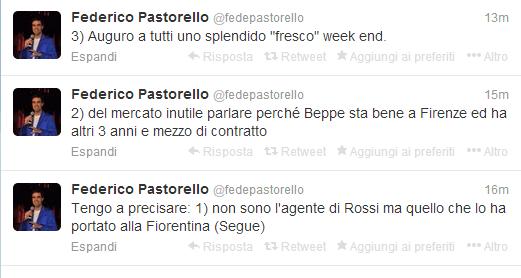 ''Tengo a precisare: 1) non sono l'agente di Rossi ma quello che lo ha portato alla Fiorentina. 2) del mercato inutile parlare perché Beppe sta bene a Firenze ed ha altri 3 anni e mezzo di contratto. 3) Auguro a tutti uno splendido "fresco" week end''.