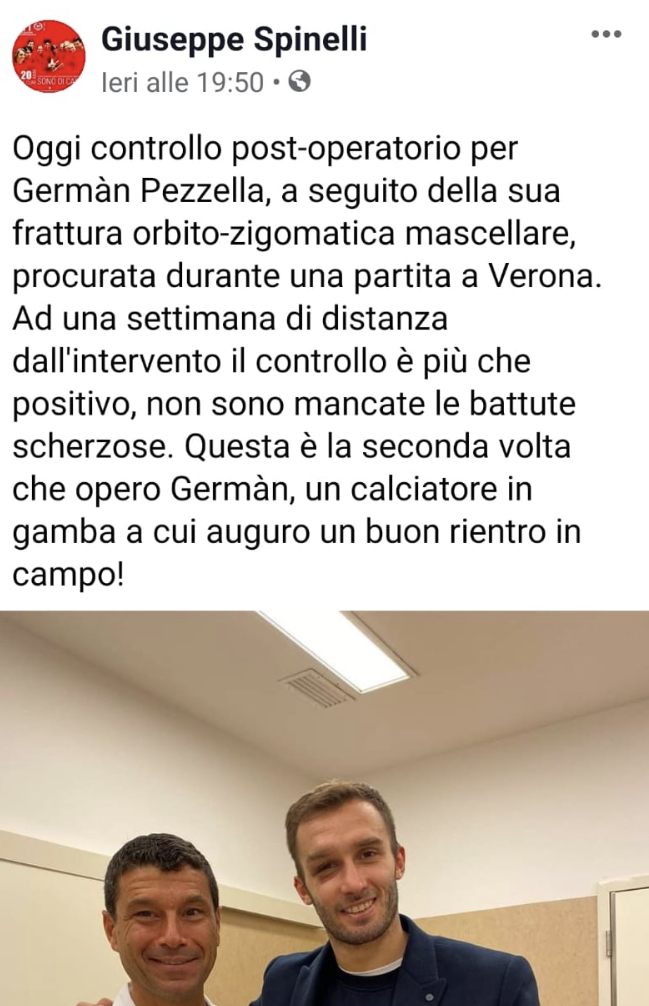 Consulto medico nella giornata di ieri per il capitano della Fiorentina, German Pezzella, a seguito dell'infortunio patito contro il Verona. Ad una settimana di distanza, il medico che lo ha operato, Giuseppe Spinelli, direttore SOD Chirurgia Maxillo Facciale di Careggi, ha potuto constatare che tutto procede per il meglio per il rientro del difensore viola. A testimoniarlo il suo post su Facebook che vi riportiamo di seguito.