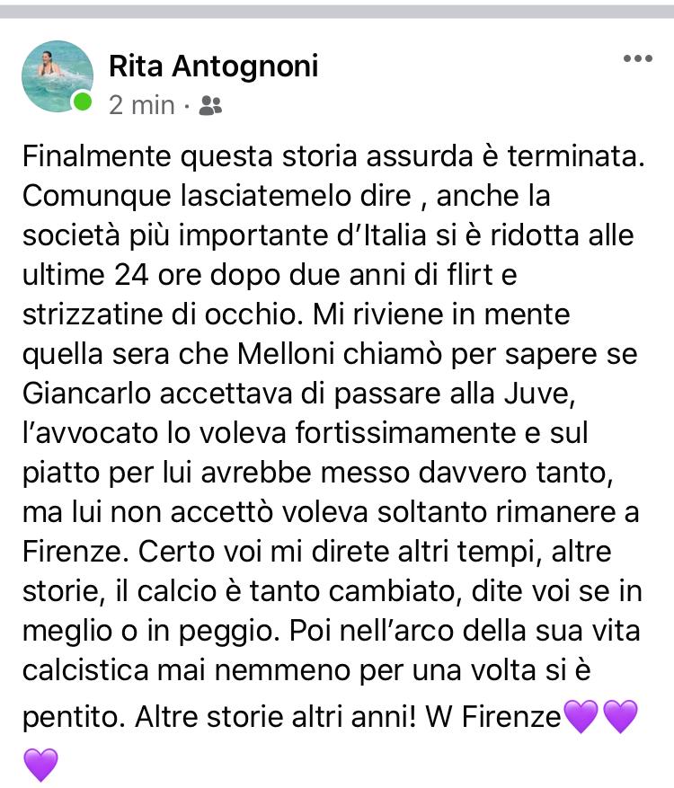 Rita Antognoni, moglie del club manager gigliato Giancarlo, ha commentato su Facebook l'addio di Federico Chiesa alla Fiorentina: "Finalmente questa storia assurda è terminata. Comunque lasciatemelo dire, anche la società più importante d'Italia si è ridotta alle ultime 24 ore dopo due anni di flirt e strizzatine di occhio. Mi riviene in mente quella sera che Melloni chiamò per sapere se Giancarlo accettava di passare alla Juve, l'avvocato lo voleva fortissimamente e sul piatto per lui avrebbe messo davvero tanto, ma lui non accettò voleva soltanto rimanere a Firenze. Certo voi mi direte altri tempi, altre storia, il calcio è tanto cambiato, dite voi se in meglio o in peggio. Poi nell'arco della sua vita calcistica mai nemmeno per una volta si è pentito. Altre storie altri anni! W Firenze".