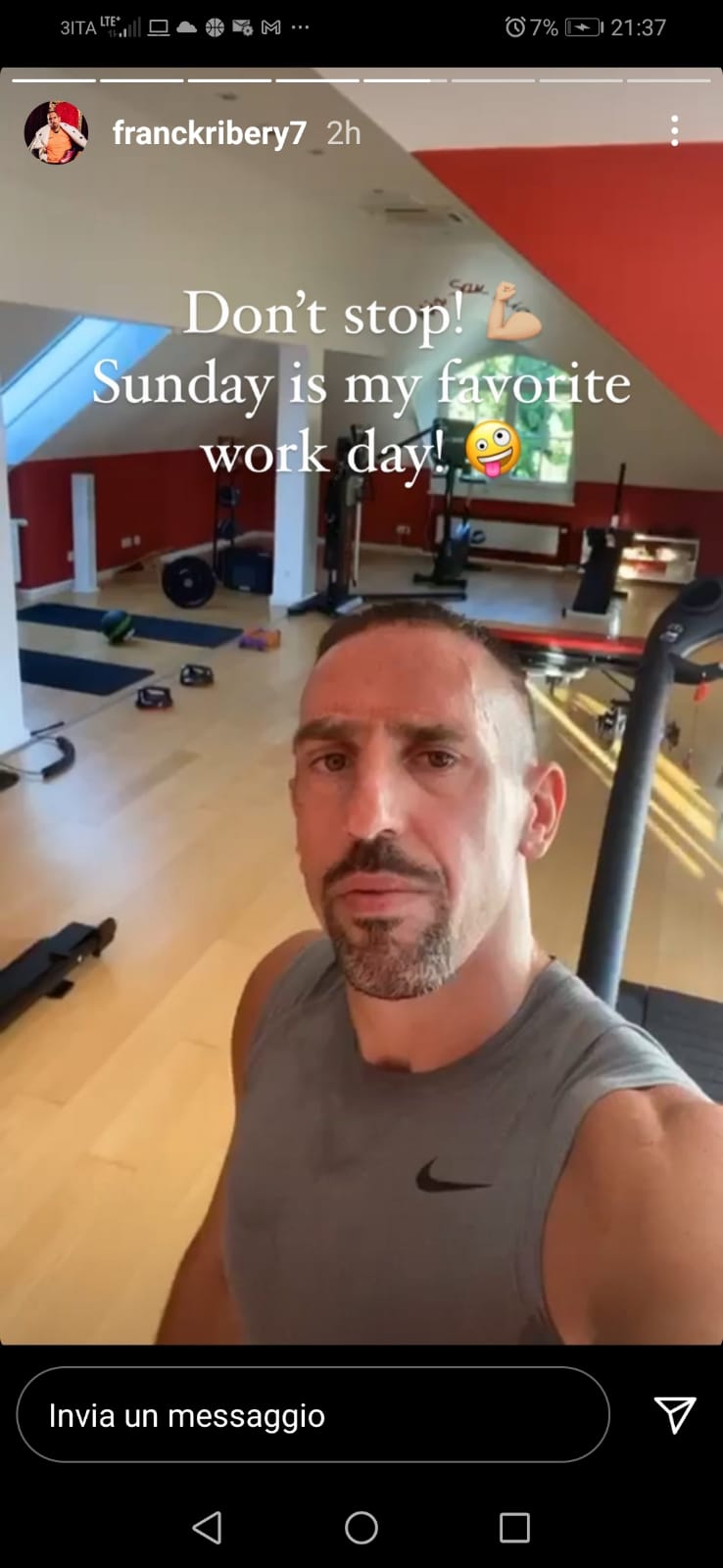 In attesa di sapere qualcosa di più sul suo rinnovo Franck Ribery continua a godersi le "vacanze" in Baviera: anche oggi l'asso francese ha postato diverse stories che lo ritraggono durante allenamenti nella sua palestra personale, con tanto di selfie finale: "Mai fermarsi, la domenica è il mio giorno preferito per allenarmi", questa la didascalia della foto con cui FR7 fa capire che, nonostante i 38 anni, il francese non ha intenzione di mollare.