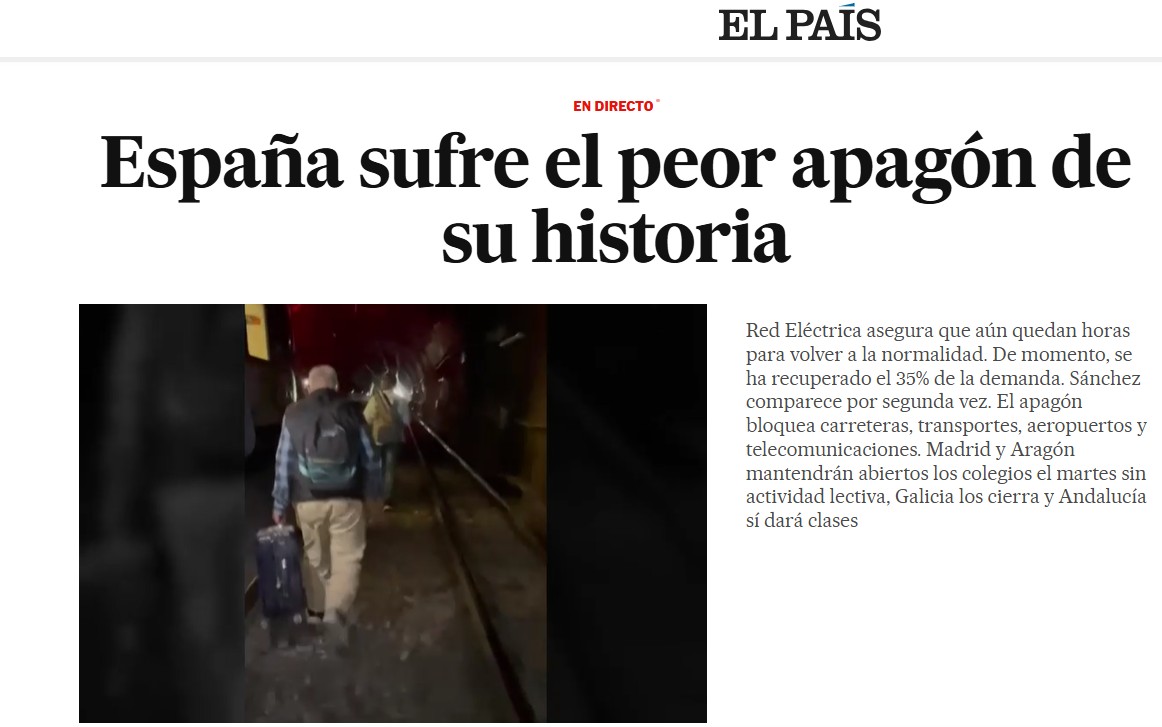 El Pais non usa mezze misure e lo definisce "il peggior blackout della sua storia". Il Presidente del Governo Sanchez, intervenuto nella serata in conferenza stampa, non ha scartato alcuna ipotesi sull'origine del blackout ma ha dichiarato lo "stato di emergenza nazionale" e ha previsto ore critiche per lo Stato spagnolo, invitando i cittadini ad usare quanto meno possibile i dispositivi mobili e gli apparecchi elettronici.