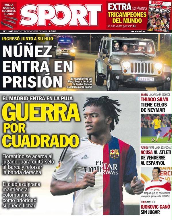 Juan Cuadrado tra Barcellona e Real Madrid. L'esterno offensivo della Fiorentina potrebbe trasferirsi a breve in Spagna, così come scrive l'edizione odierna di Sport che titola "Guerra per Cuadrado". Il quotidiano iberico ha pubblicato in prima pagina una foto del calciatore viola con metà maglia delle merengues e l'altra blaugrana (vedi foto in allegato), scrivendo come il presidente del Real Florentino Perez stia provando a inserirsi nell'affare (con 35 mln di euro) per bruciare la concorrenza catalana e rinforzare le corsie della formazione di Carlo Ancelotti (che utilizzerebbe il colombiano come terzino destro. Intanto però il Barça non molla, con lo stesso Cuadrado che rappresenta ancora una priorità per Luis Enrique dopo la fumata nera andata in scena nello scorso mercato estivo.