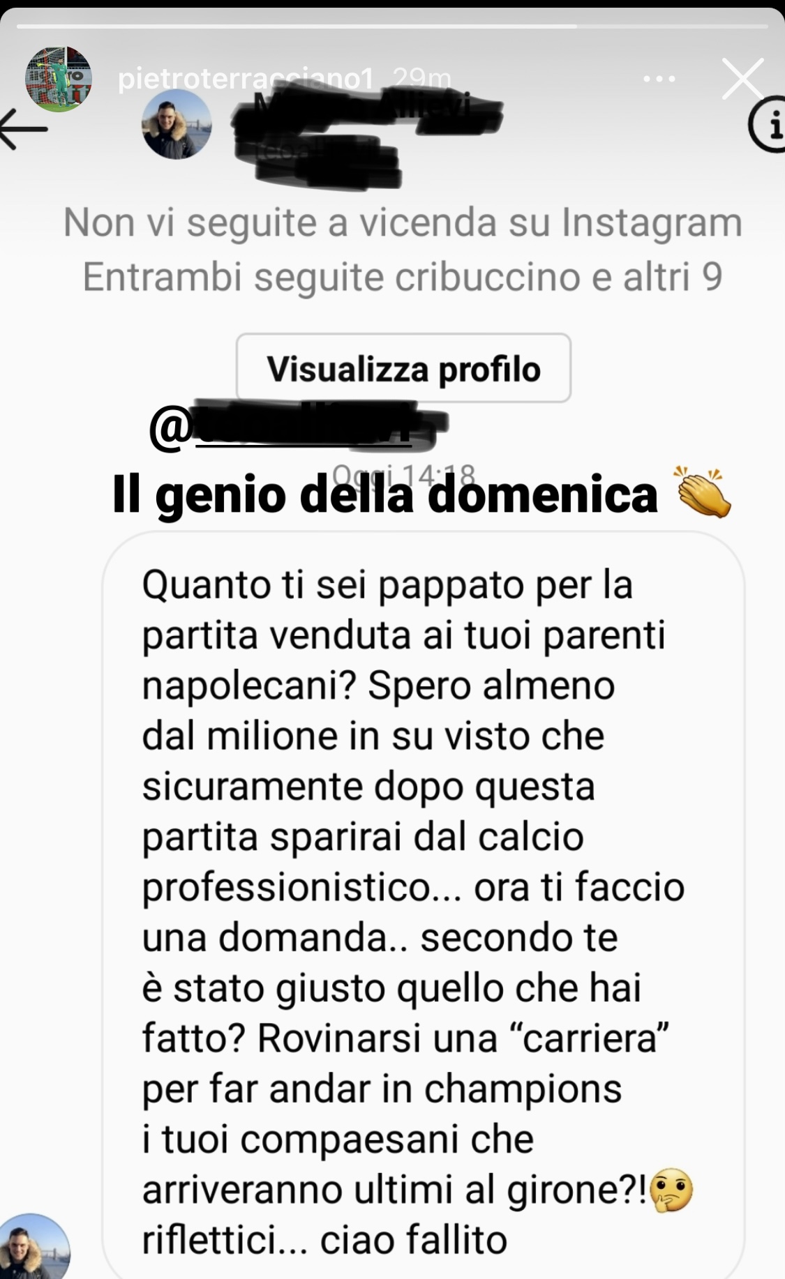 Scintille via social tra Pietro Terracciano, portiere della Fiorentina, e un tifoso (evidentemente della Juventus): l'estremo difensore della Fiorentina ha infatti pubblicato sul suo profilo Instagram una foto che immortala il testo di un messaggio privato recapitato in direct al numero uno viola in cui veniva attaccato per aver "venduto ai suoi parenti napoleCani" la partita di oggi contro il Napoli. "Ecco il genio della domenica" ha commentato Terracciano. Questa la foto del post: