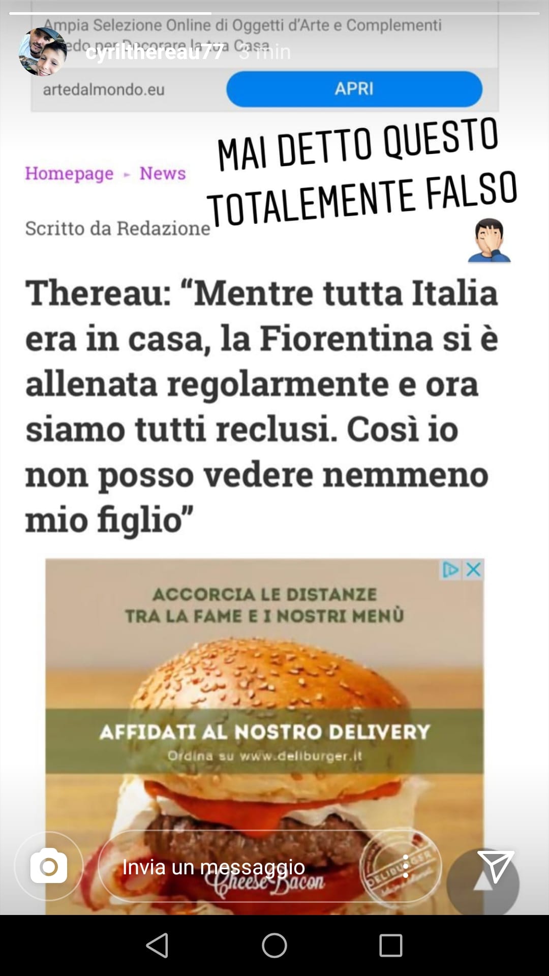 Cyril Thereau prende posizione circa una sua presunta intervista rilasciata al quotidiano francese La Provence: il numero 77 viola - che al giornale transalpino avrebbe dichiarato: "L’Italia adesso si è chiusa in casa ma noi lunedì e martedì scorso ci siamo allenati regolarmente. Adesso dopo il contagio dentro il nostro spogliatoio non possiamo più lasciare la nostra casa. Dato che ci sono stati casi positivi, siamo obbligati starcene per quindici giorni in disparte nelle nostre abitazioni. Pensate, non posso vedere neppure mio figlio” - ha smentito tassativamente attraverso il suo profilo Instagram di aver pronunciato simili frasi: "Mai detto questo, totalmente falso" ha scritto l'ex Udinese. A conferma di quello che ha scirtto Thereau c'è il fatto che, contrariamente a quanto dichiarato in questa intervista, la Fiorentina lunedì e martedì scorso in effetti non si è allenata.